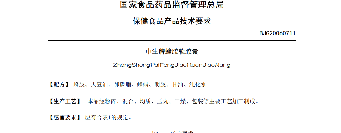 主要原料: 蜂胶、大豆油、卵磷脂、蜂蜡、明胶、甘油、纯化水